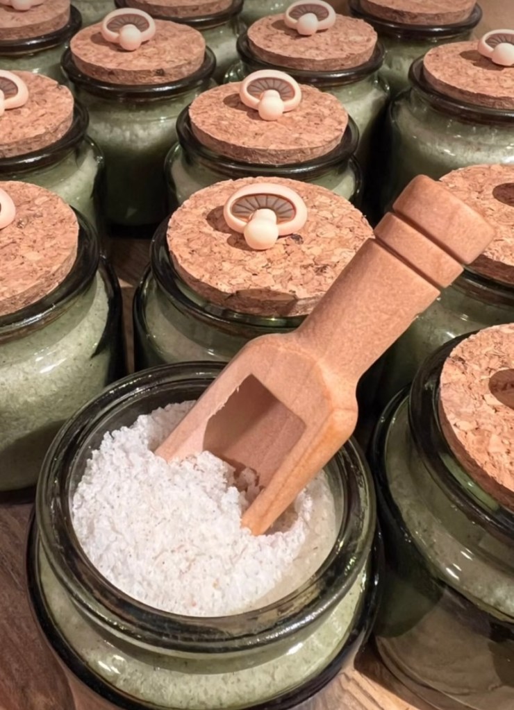 Packaged in a beautiful green glass jar with a cork lid—topped by the cutest little mushroom—these bath salts include a handy wooden scoop. Perfect for a relaxing, aromatic soak that transports you to a forest retreat.