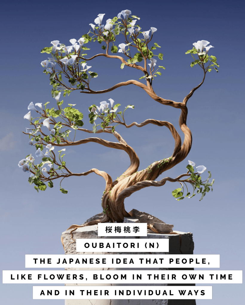 Oubaitori (Oh-bye-toh-ree) is a Japanese concept referring to four flowering trees—cherry, plum, peach, and apricot—each blooming in its own distinct way and timing. Rather than comparing one to another, each blossom is celebrated for its authentic beauty. This idea resonates with our mission to honor the unique pace at which every individual and brand grows.